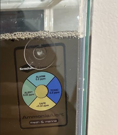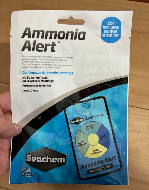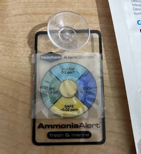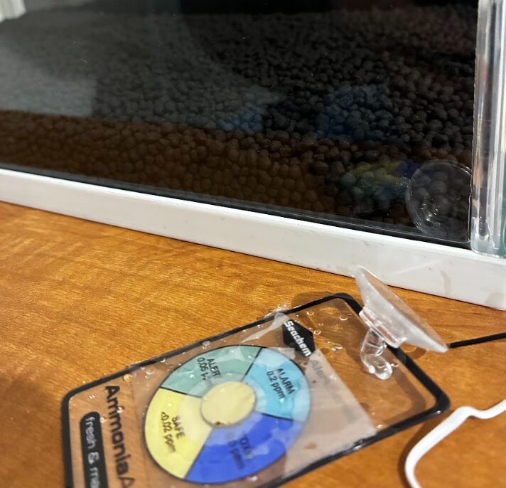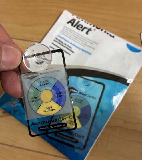 次は、アンモニアアラートを水槽に貼っていきます。水槽に入れてから、数時間から1日くらいで水槽内のアンモニアがわかるようですね。水槽のアンモニアの数値を参考にして、エビの投入時期を判断するためです。