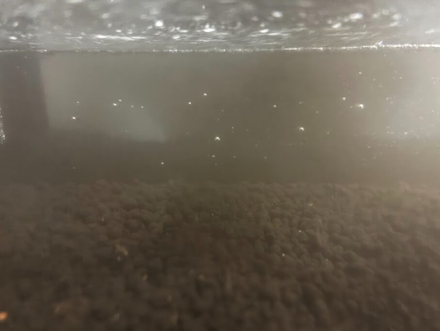 この量でちょうどポンプの吐き出し口も隠れたので完了にします。そして、電源をONにします。