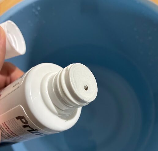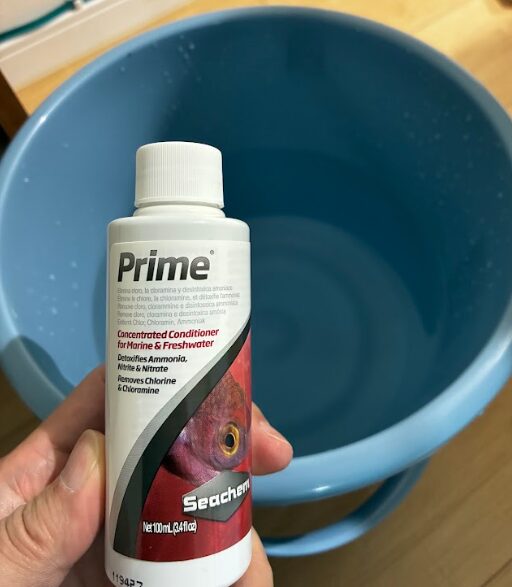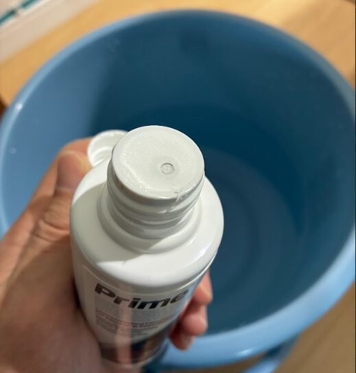 そこに、seachem(シーケム)社のprime(プライム)を投入します。計算すると5Lだと2滴くらい?「ホントか?」と思いながらも、2滴たらして、バケツの中の冷え切った水を手でかき回します。