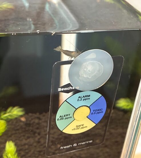 シーケムのアンモニアアラートの上にのっています。前までは、タニシの小さいのが這っていましたが、最近は見なくなりましたね。下のソイルとかも冒険しだしてるので、その影響でしょうね。